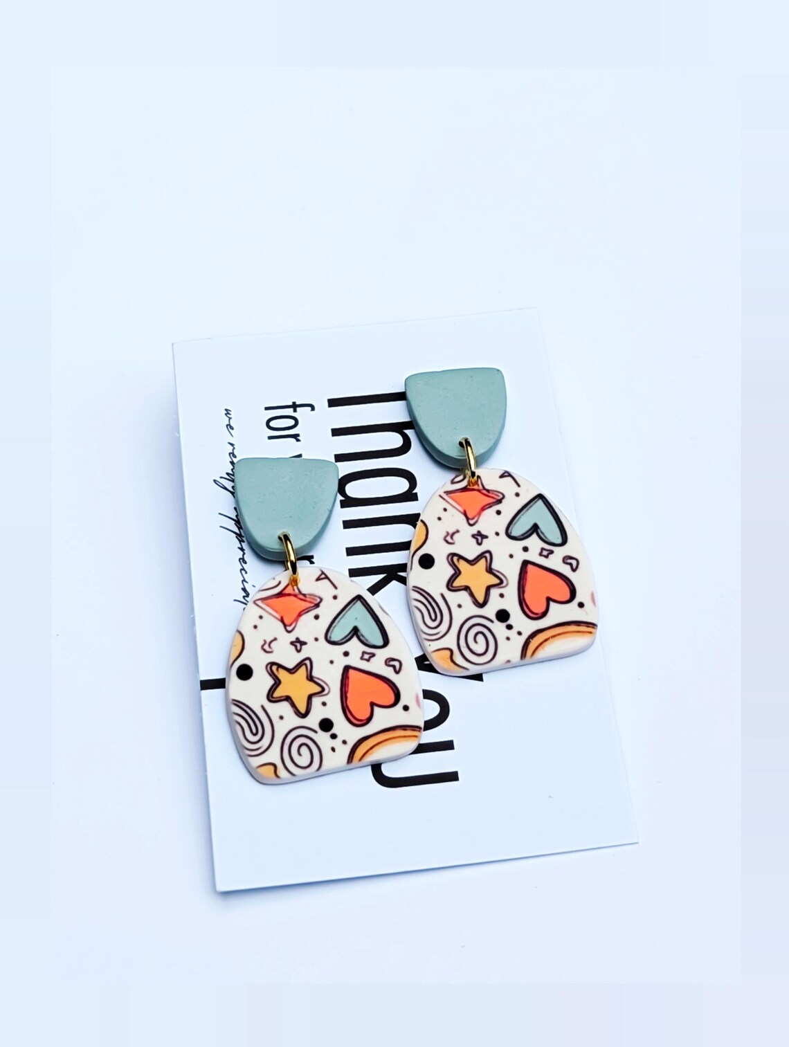 Embrace your inner ’90s kid with these unique, handmade earrings. These one-of-a-kind dangle earrings capture the fun and vibrant spirit of the Y2K era, featuring a whimsical pattern of orange hearts and yellow stars with soft, swirling accents. The elegant and simple top piece in a cool, light blue-green hue perfectly complements the playful design of the main drop.
